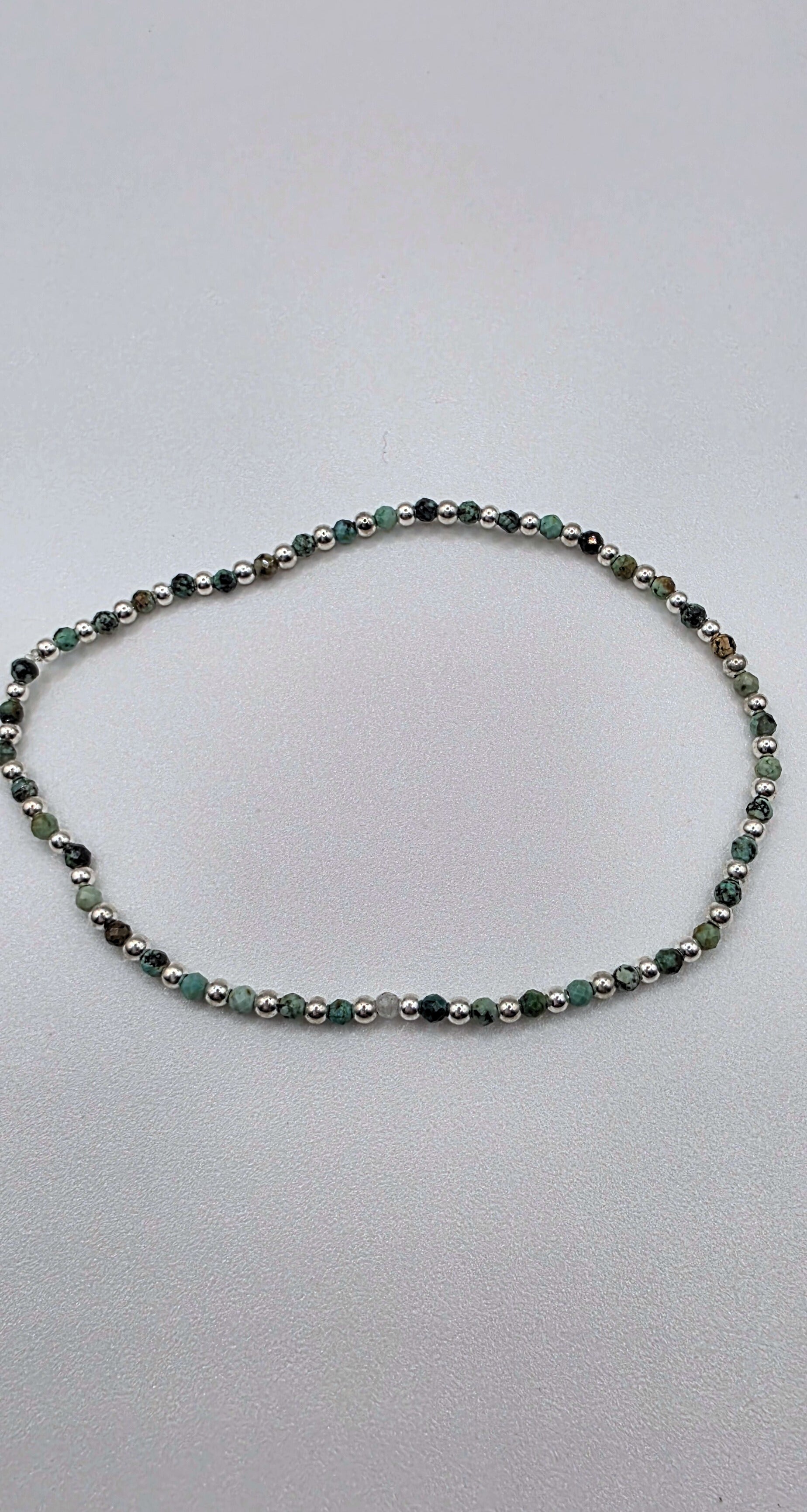 This design includes beads of faceted African Turquoise and Sterling Silver.